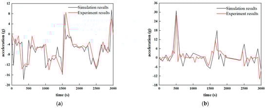 In Figure 5, a comparison of the acceleration rates at the vehicle centroid in the test and in the simulation reveals that the trend of the three-way acceleration curve in both cases was essentially consistent, with peak values at each moment of ground impact. The level of fit was high, and although the peak values differed slightly, they fell within an acceptable range of ±5%.