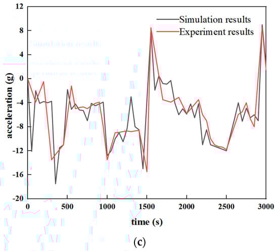 Comparison of three-way acceleration curve between simulation and test at the center of mass: (a) X direction acceleration comparison; (b) Y acceleration; (c) Z acceleration.