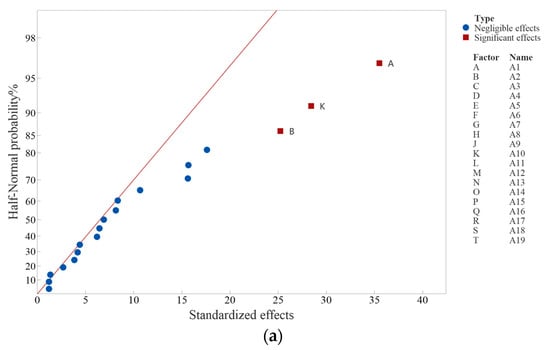 The normal or semi-normal graph method is a graphical analysis approach proposed and refined by Daniel [22]. The method involves plotting the estimated effect values on a normal or semi-normal probability plot. In the plot, the points corresponding to non-significant effects should be approximately arranged in a straight line, while the points corresponding to significant effects should be far away from this straight line. This is because, assuming that the error is normal, independent, and of the same variance, the effect estimators are mutually independent. The estimator with zero effect follows the same normal distribution, with an expectation of zero. Therefore, the observed value on the (semi) normal probability plot should be located on a straight line passing through the origin. For the estimator with a non-zero effect, its expectation is non-zero, and it should deviate from the line passing through the origin.