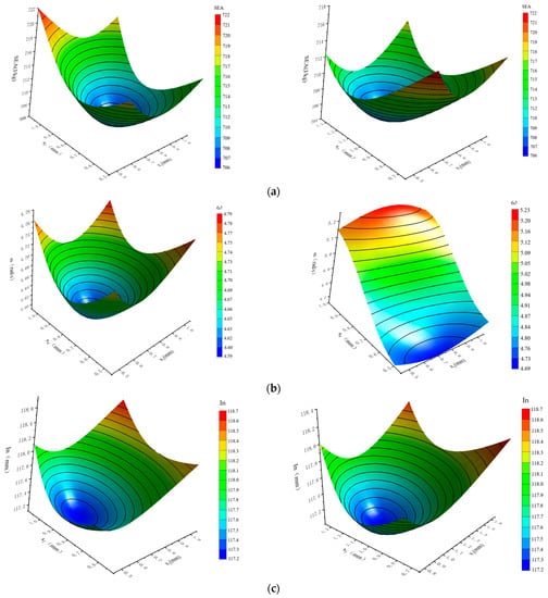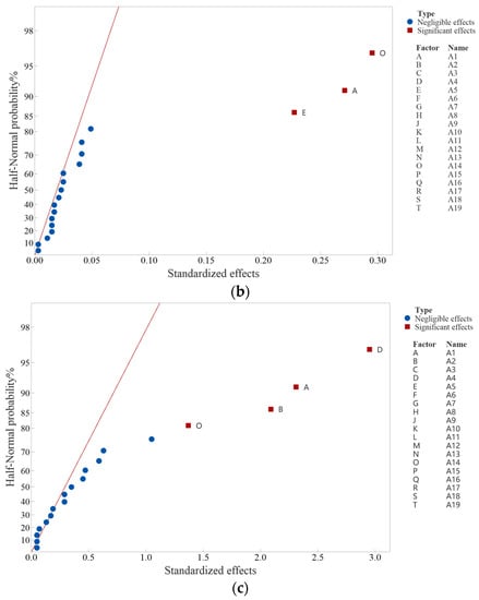 The response variables SEA, ω, and In in Table A1 (Appendix A) represent the observation vectors Y = (y1, …, yn)T. Considering the absence of interaction between factors, a two-level orthogonal saturated design can be assumed. Therefore, = xi’y/xi’xi (0 ≤ i ≤ m) represents the best linear unbiased estimate (BLUE) of βi, and is normally distributed, with an expectation of βi and a variance of τ2 = σ2/n. The following is a factor screening analysis from three aspects.
