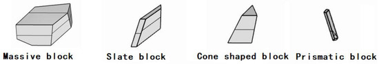 According to the shape of the block, it can be divided into block, slab, prismatic block, and cone block. Among them, the block is a block of approximately equal length in x, y, and z directions. The slate is a block whose length in one of the three directions of x, y, and z is much smaller than the length in the other two directions. Prismatic blocks are blocks whose lengths in one or two of the x, y, and z directions are much smaller than the lengths in the other direction. Cone-shaped blocks have a prismatic shape. The specific rock block shape classification is shown in Figure 3.
