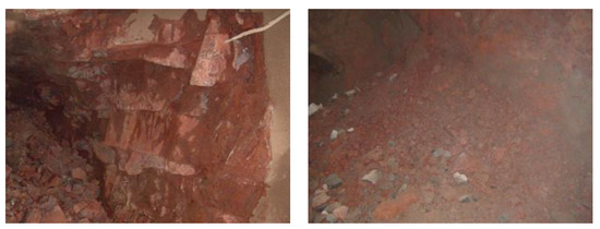 When the strength of the surrounding rock is much greater than the stress it is subjected to, the deformation damage mode is mainly structural face control type; such deformation damage is mainly in the role of gravity, as the block along the structural face of the prograde slip, there is generally little plastic flow. Among them, the deformation and damaged form of the surrounding rock of the inlaid fractured structure are broken loose; broken loose is the main form of deformation and damage of a fractured structure rock body. Sidewall parts are prone to slip deformation along the weak structural surface to drop blocks and weak interlayer extrusion deformation, mainly by a group of good penetration of the smooth dip medium and steep dip joints (or faults) and the combination of counter dip joints cut to block slip destabilization. Examples of structure-controlled damage of rock masses are shown in Figure 5.