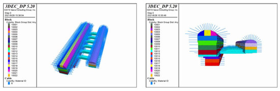 In 3DEC discrete element software, a fixed displacement boundary is set at the bottom to limit the deformation of the bottom; The displacement boundary and stress boundary are set at the front, back, left, and right of the model, and the initial geo-stress is set inside the model. Under engineering conditions, the initial geo-stress is mainly generated by gravity. The vertical stress is converted by gravity, the horizontal stress is taken as 0.5 times the vertical stress, and the stress value increases linearly with depth. The rock mass model is set as an elastoplastic Mohr–Coulomb model and the structural plane is set as a Coulomb slip model.