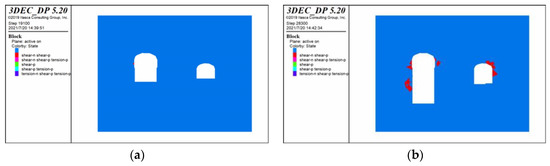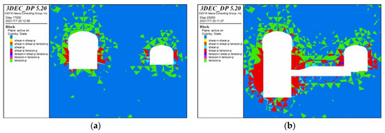 Map of plastic zone under-supported condition in section A4; (a) Step 7 excavation plastic zone map; (b) Step 11 excavation plastic zone map.