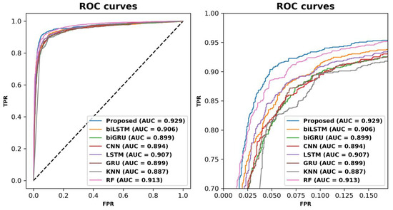 Receiver operating characteristic (ROC) curves of ABPCaps and baselines on an independent test set. The left panel shows the ROC curves of ABPCaps and baselines, while the right panel is an enlarged view of the same graph for better visibility.