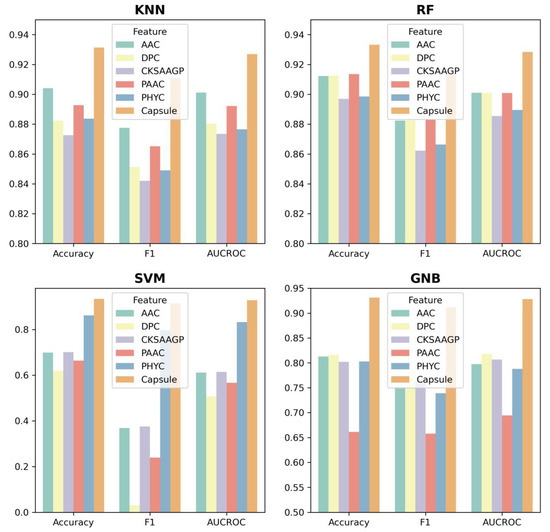 To further evaluate the performance of ABPCaps, four basic machine learning-based classifiers, including KNN, RF, SVM, and Gaussian naive bayes (GNB), were used to compare the performance of hand-crafted features and features extracted by ABPCaps on five hand-crafted features, ACC, DPC, PAAC, CKSAAGP, and PHYC. Accuracy, F1-score and AUROC were chosen as evaluation metrics. The results in Figure 4 show that the features extracted by ABPCaps outperform the other five hand-crafted features for all four classifiers, especially for KNN and GNB. This suggests that the features learned by ABPCaps would be more effective for the identification of ABPs, as well as being more suitable for general classification. In short, ABPCaps is a powerful tool that can automatically generate and extract critical features from peptide sequences using a capsule network.