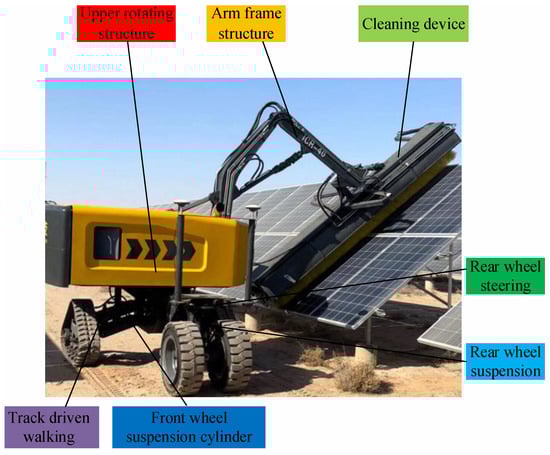 A novel type of self-propelled photovoltaic panel cleaning robot structure was proposed in accordance with the height and arrangement of photovoltaic panels in photovoltaic power stations and the complexity of the road surface. In general, the composition of the robot comprised chassis structure and upper structure, which were connected to each other through rotary drive components. The design of the chassis structure primarily aimed to adapt to complex road environments, maintain the chassis level during the operation of the vehicle, and avoid the jitter phenomenon of the arm frame structure when cleaning the photovoltaic panel surface. The design of the boarding mechanism was constructed mainly to meet the height of the photovoltaic panel and the arrangement requirements of different forms so that intelligent control can be achieved in the cleaning process. Figure 1 and Figure 2 present the 3D design and physical cleaning operation of the self-propelled photovoltaic panel cleaning robot.