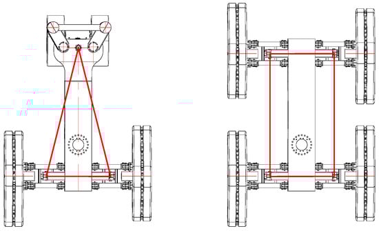 When designing the chassis structure of the photovoltaic panel cleaning robot, two different chassis layout methods of three wheels and four wheels were proposed from the perspective of road complexity, high drive and stability. The three-wheel type was driven by the wheel–track composite drive, and the four-wheel type was completely driven by the track. The layout is presented in Figure 3.