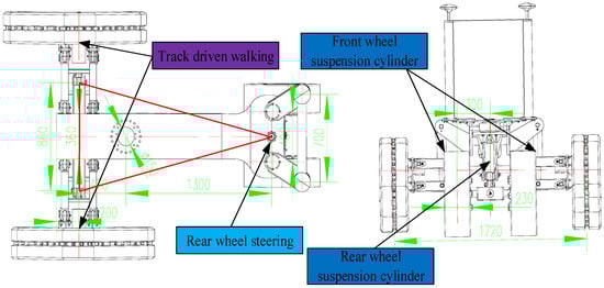 The chassis structure was designed using Solidworks 2016 to adapt to complex road environments. The chassis structure design comprised three parts, i.e., track-driven walking device, front- and rear-wheel suspension device, and rear-wheel tire steering device. Each part was connected through the pin shaft structure. Using track wheels as the driving walking device can increase the contact area with the ground and improve traction force. The front- and rear-wheel suspension devices use three plunger cylinders to achieve adaptive leveling of the chassis. The rear tire steers independently, which can reduce the turning radius and improve the flexibility of the whole machine. The encoder was installed at its rotary center to achieve closed-loop control and improve the accuracy of control. As shown in Figure 4.