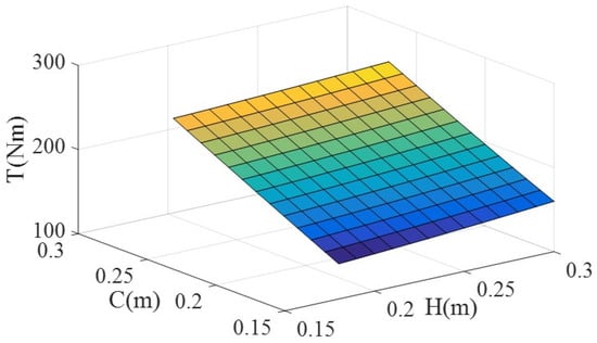 where Mh is the load on the rear tire group, δ is the friction coefficient between the tire and the ground, Hm is the tire width, and D is the eccentricity; the width range and eccentricity range of the tire were set as well as the change in the steering resistance torque were analyzed.