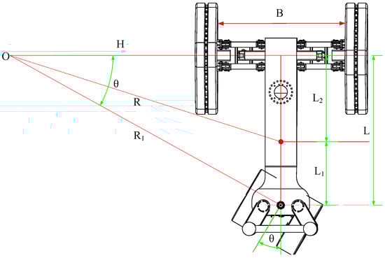 where R1 denotes the rear-wheel steering radius; R represents the chassis centroid steering radius; H expresses the front axle steering radius; L is the chassis wheelbase; L1 denotes the centroid distance from the rear axle distance; L2 is the centroid distance from the front axle distance, vl is the left track speed, vr is the left track speed; B expresses the front wheel track; θ represents the rear-wheel steering angle.