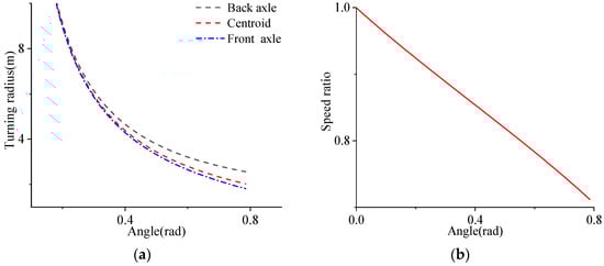 Relationship between rear-wheel steering angle and turning radius, front-wheel speed ratio. (a) Turning radius; (b) speed ratio.