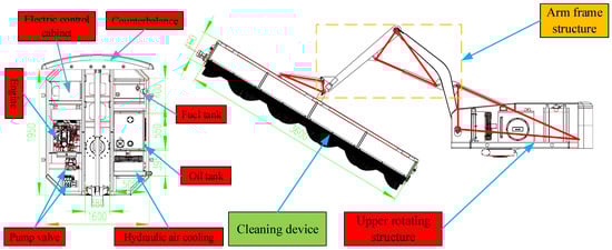 In general, the composition of the upper structure comprised three parts, i.e., the upper rotating structure, the arm frame structure, and the cleaning device. The engine, load sensitive pump, multi-way valve group, electric control cabinet, fuel tank, etc., were installed in the upper turning structure of the vehicle to achieve the hydraulic drive of the entire vehicle. The triangular design of the boom structure was adopted to make the structure stable and ensure the stability of the cleaning device during operation. Three cylinders were used to drive the boom mechanism to rotate, and sensors were used to realize closed-loop control to improve the accuracy of control. The cleaning device was designed as a rolling brush structure which realizes the cleaning of dust particles on the smooth surface under the drive of the cleaning motor without hydration operation; in addition, this design reduces the cost of the device. All structures were connected and fixed by pins and bolts to ensure that the upper structure can meet the requirements of photovoltaic panel cleaning in harsh environments. As shown in Figure 10.