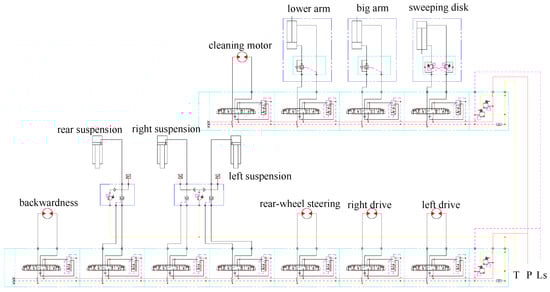 In general, the hydraulic system of the photovoltaic panel cleaning robot drove the entire machine through the load sensitive pump driven by the engine so that the normal operation requirements of the entire machine’s hydraulic system in low-temperature environments could be ensured. Following the different functional requirements of the entire machine, the upper control valve group and the chassis control valve group were designed. The upper control valve group mainly realizes the functions of upper rotation, arm posture adjustment, and front and back cleaning. The control valve group of the vehicle was mainly used to achieve the functions of front and rear travel of the track device, three-point leveling of the suspension system, and independent rear wheel drive. As shown in Figure 13.