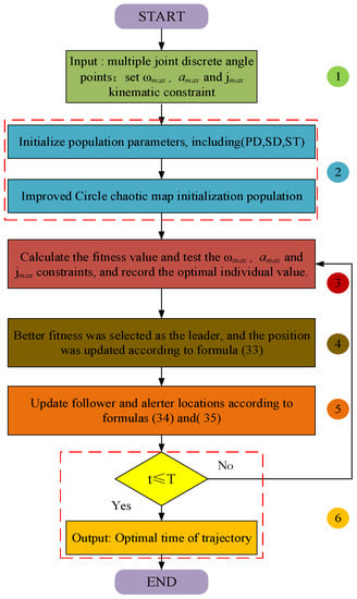 The steps for optimizing the trajectory time of the photovoltaic panel cleaning robot arm for the optimized sparrow algorithm are as follows (Figure 18):