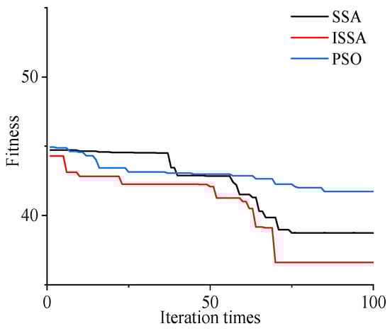 The discrete path points of the operation trajectory of the end cleaning device in Table 4 were selected, and the general parameters of the sparrow algorithm were set. To be specific, the population size was 20, the iteration number was 100, the leader proportion was 20%, the early warning proportion was 10%, and the early warning value was 0.8. For the PSO algorithm parameters, the population size was 30, the iteration number was 100, the maximum inertia weight was 0.9, and the minimum inertia weight was 0.4. To ensure the stability of the boom during operation, the angular velocity constraint of the respective path segment was set to 10°/s, the angular acceleration of each path segment was 3°/s2, and the angular acceleration of the respective path segment was 3°/s3; the time interval between each path point reached [6 s, 5 s, 5 s, 7 s, 5 s, 7 s, 10 s], with a total time of 45 s. The three algorithms implemented the overall time-optimal trajectory planning for the upper arm of the photovoltaic panel cleaning robot, and the corresponding convergence curve of the fitness of the particles of the entire manipulator are presented in the following figure.