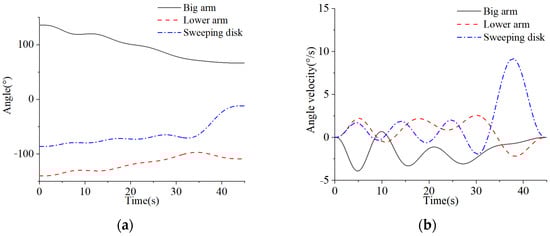 In accordance with the optimized sparrow algorithm, the time-optimal solution was performed under the condition that the kinematics constraints of the respective joints of the boom were satisfied. Moreover, the following figure presents the angle, angular velocity, angular acceleration, and angular acceleration of the respective joints of the boom mechanism of the photovoltaic plate cleaning robot before and after the output optimization.