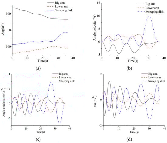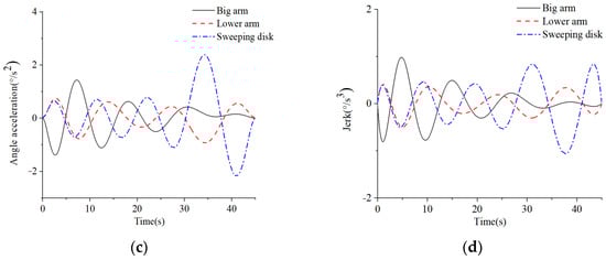 Changes in various joints of the optimized boom mechanism. (a) Angle; (b) velocity; (c) acceleration; (d) jerk.