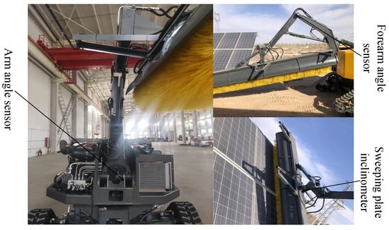 The cleaning trajectory of the photovoltaic panel cleaning robot arm was studied experimentally to investigate the reliability of the optimal trajectory planning based on the optimized sparrow algorithm combined with the seven-order non-uniform B-spline curve interpolation time. During the experiment, through the mapping relationship between the joint space and the drive space, the displacement variable of the hydraulic actuator was converted into the angle variable, and the angle sensor was used to realize the closed-loop control of the respective joint angle to improve the accuracy of the control. The sensor installation position of the respective joint of the boom is shown below.