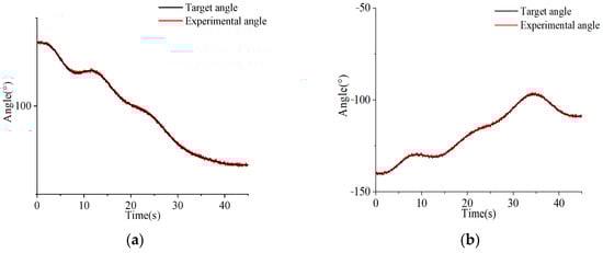 During the experimental process, the functions of the three joint angle variables over time after fitting the seven-degree non-uniform B-spline curve were used as input variables. The inclination angles of the respective joint detected by the sensors installed on the arm mechanism were fed back to the controller through the bus and compared with the input. The difference was then used as the input of the control system to control the action of the multi-way valve, achieving closed-loop control, thereby improving the accuracy of system control and avoiding damage to the photovoltaic panel surface caused by low precision control of the end cleaning device. The trajectory tracking curve and cleaning effect of the respective joint of the arm frame before and after optimization are shown in the following Figure 22.