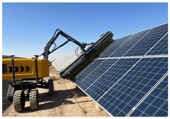 Regarding control, Divyavani et al. [23] studied a novel photovoltaic panel cleaning system using FPGA and infrared sensors to identify the cleaning path and verified the effectiveness of the system through experiments. The power generation efficiency of the cleaned photovoltaic panel was increased by 35%. Amin et al. [24] developed an automated monitoring and cleaning system for photovoltaic panel surfaces. The developed system is capable of evaluating the degree of dust accumulation by monitoring the color of the photovoltaic panel surface so that the robot can be driven to clean the dust accumulation area. Al−Jarrah et al. [25] developed a speed control strategy for the photovoltaic panel cleaning robot to increase the corresponding rapidity and stability. It was ensured that the swing arm can move up and down along the photovoltaic panel surface. Morando et al. [26] adopted UAV to inspect and maintain photovoltaic power plants and proposed a strategy of segmentation and visual servo tracking of photovoltaic modules to monitor the dust accumulation on photovoltaic panels and elevate the intelligence level of photovoltaic power plants. Rehman et al. [27] developed a control system for unmanned aerial vehicles (UAVs) to clean photovoltaic panels which employed downward thrust during cruise to remove the dust on the panels. The effectiveness of the system was verified experimentally. Gupta et al. [28] proposed a self-cleaning photovoltaic sliding system which was validated experimentally to increase the efficiency of photovoltaic power generation and protect it from damage from the natural environment.
