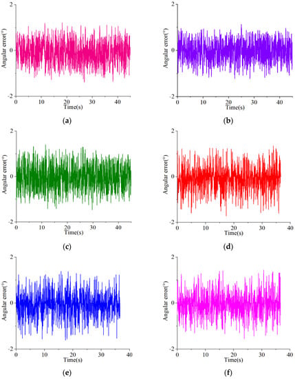 Trajectory tracking error of each joint of cleaning boom before and after optimization. (a) Unoptimized big arm; (b) unoptimized lower arm; (c) unoptimized sweeping disk; (d) optimized big arm; (e) optimized lower arm; (f) optimized sweeping disk.