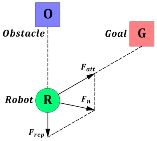 The artificial potential field (APF) method is a widely recognized motion planning strategy in the field of robotics. In 1986, Oussama Khatib first proposed the artificial potential field method (APF) for the motion planning of robots [13]. The APF method extensively borrows the concept of potential fields from physics and transforms the path planning problem of robots or moving objects into a problem of searching for the optimal path in a virtual potential field. The core idea is to consider the target location as an attractive source and obstacles or infeasible areas as repulsive sources. High potential fields are assigned around obstacles, while low potential fields are assigned around the target location. By calculating the forces and directions, the APF guides the robot or object to move along the direction of decreasing potential energy, thereby achieving the goal of avoiding obstacles and reaching the target location.