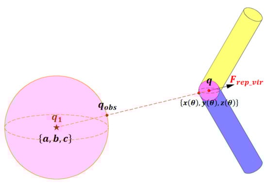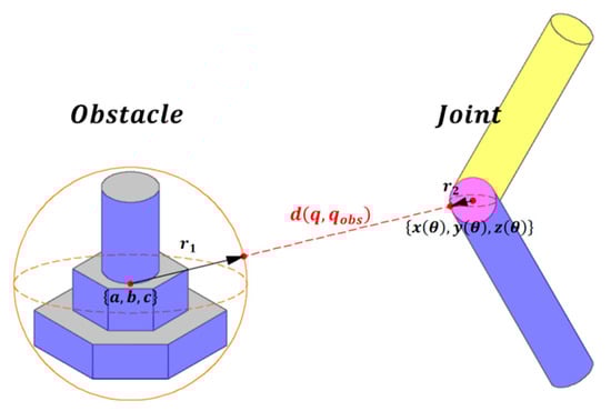 For an obstacle with a complex shape, it can be enveloped by a single sphere. According to the conclusion of Section 2, the position configuration coordinates of q are determined by a series variable of the joint angle, and can be solved by kinematics. Therefore, the coordinates of q can be expressed as . Then, the shortest distance between the joint of the robot and the obstacle can be expressed as (13):