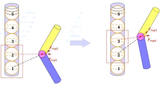 On the left side of Figure 5, ball 2 is closest to the joint, and the robotic arm is subject to the repulsive force of ball 2 and the adjacent ball 1. When the robotic arm moves to the next state, as shown in the right side of Figure 5, ball 3 is closest to the joint and the robot is subject to the repulsive force of ball 3 and the adjacent ball 2.
