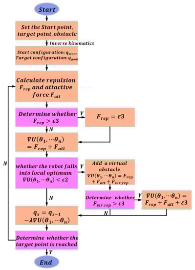 The flowchart of the artificial potential field algorithm in joint space is shown in Figure 8, and the pseudocode is shown in Algorithm 1. The values of , , and can be adjusted appropriately according to the requirements. It can be seen that each iteration only requires the calculation of the potential field function once from the algorithm flowchart. The configuration at the starting position and the target position are obtained by inverse kinematics. In order to obtain a smooth obstacle avoidance trajectory, the values of and are limited to less than .