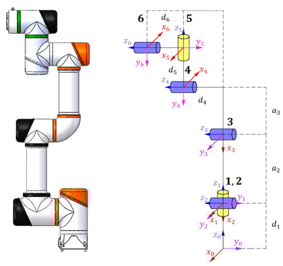 In this paper, the ROCR6 is our research object. ROCR6 is a six-axis robotic arm developed by a Chinese company, Si Valley. Figure 9 shows the structure and coordinate system of the robot, and Table 1 shows the modified D-H parameters of the 6-DOF robot.