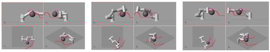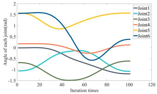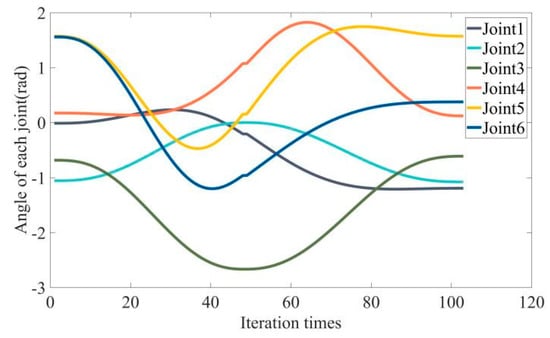 Table 2 shows the task information and the parameter details of the spherical obstacle. The motion process of the robotic arm using the APF algorithm is shown in Figure 10, where the red trajectory represents the running trajectory of the middle joint and end-effector. The change in each joint angle using the improved APF algorithm is shown in Figure 11, and the change in each joint angle using the genetic algorithm is shown in Figure 12, and their operation indexes are shown in Table 3. Table 4 compares the running time of our algorithm with each of the algorithms in Section 3.5.