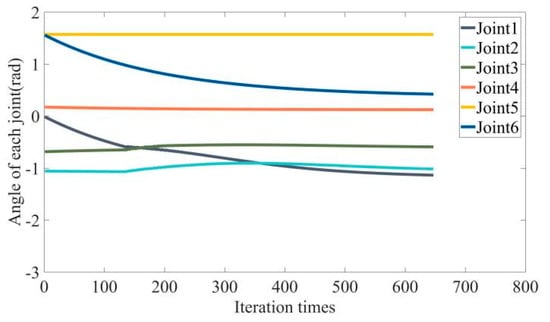 h is the iteration step size. This method requires calculating the potential field function twice to obtain the gradient direction of a joint angle, and each cycle requires calculating the gradient of six joint angles. Therefore, the method requires 2n calculations of the potential field function per cycle, while our algorithm only needs to calculate the potential field function once in each cycle. Thus, the algorithm in this paper has a higher real-time performance.