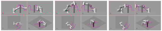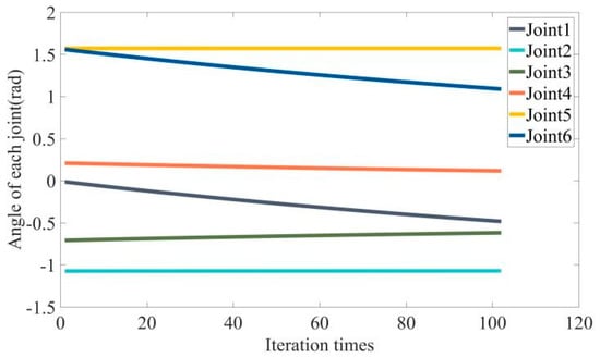 Table 5 shows the parameter details of the rectangular beam. The motion process of the robotic arm using the APF algorithm is shown in Figure 13, where magenta trajectory represents the running trajectory of the middle joint and end-effector. The change of each joint angle using the improved APF algorithm is shown in Figure 14, the change of each joint angle using genetic algorithm is shown in Figure 15, and their operation indexes are shown in Table 6. Table 7 shows the running time of each algorithm.