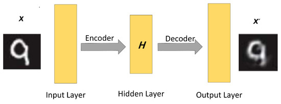 An autoencoder (AE) is an unsupervised neural network optimized so that its output copies its Aninput [9]. The area of unsupervised anomaly detection uses them frequently [10,11]. AEs learn relevant feature representations of their input. As shown in Figure 1, two phases make up the AE model: the encoder and the decoder. The encoder, represented as H = f ( X ) , is responsible for compressing the input X into a lower-dimensional latent representation H.