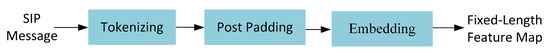 The proposed approach for feature extraction is different from previous machine learning approaches for detecting VoIP attacks, as designing features that accurately represent messages is necessary [12,24]. Figure 2 illustrates the feature extraction process. It starts by tokenizing messages, padding them, and embedding them.