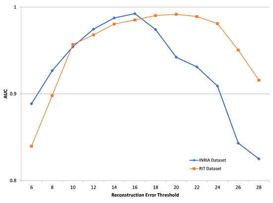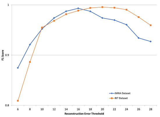 For the D1-DCAE model, the values from 6 to 28 are tested for the reconstruction error threshold. Figure 4 and Figure 5 show the reconstruction error threshold against the model detection performance for the INRIA and RIT validation datasets. In the case of the INRIA dataset, the best F1 score and AUC were achieved when the reconstruction error threshold equals 16, while the best F1 score and AUC for the RIT dataset were achieved at a value of 20.