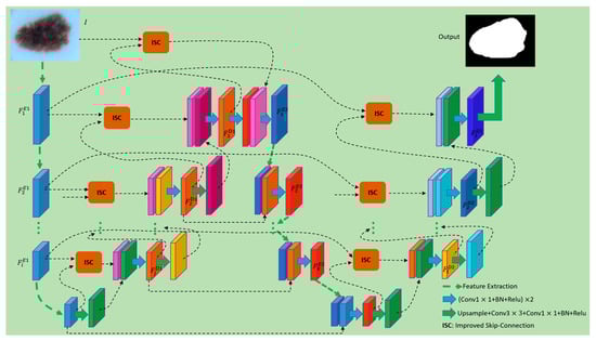 In recent years, deep learning technology has played an important role in the field of computer vision, and it is rapidly being applied to other fields, especially in the field of medicine. FCN [6] stands out as one of the initial deep learning architectures specifically designed for end-to-end training, which enables pixel-wise predictions in semantic segmentation tasks. U-Net [7] is a network with an end-to-end encoder–decoder structure, and it overcomes the shortcoming that FCN cannot keep some pixel spatial position information and context information, which leads to the loss of local features and global features. Liu et al. [8] proposed that the U-shaped end-to-end network is the best medical image segmentation architecture. The U-Net structure includes two stages: the first stage is the down-sampling process, which is mainly responsible for feature extraction, and the second stage is the up-sampling process based on the first stage, which is responsible for outputting the feature map with the same size as the original sample. Because the features obtained in the first stage comprise highly compressed feature information, and the task of image segmentation needs to classify each pixel in the image, it cannot completely rely on up-sampling features, and it needs to be supplemented with the information in the down-sampling process. The skip-connection operation is used in U-Net. On the basis of U-Net, many people have improved this network. For example, Zhou et al. [9] proposed U-Net++. This network changes the original U-Net layers, redesigns the skip-connection in the original network, and adds depth supervision to different segmentation tasks to achieve a good segmentation result. Because of the excellent performance of U-Net in medical image segmentation tasks, this framework is widely used for lesion segmentation in organs, such as the eyes, heart, liver, brain, skin, prostate, and breast. Li et al. [10] proposed ANU-Net for the organ cancer segmentation task. The network has achieved good segmentation results on the LiTS (liver tumor segmentation) dataset and the CHAOS (combined healthy abdominal organ segmentation) dataset with dense skip-connection and an attention mechanism. Zhang et al. [11] proposed DIU-Net, which integrates the inception module and the dense skip-connection module into U-Net to increase its width and depth. This network is used to segment the brain tumors of MRI images and computed tomography images of lungs and retinal blood vessels, and it achieves good results. Jha et al. [12] proposed DoubleU-Net, which is a combination of two U-Net structures. The first U-Net uses pre-trained VGG-19 as the encoding network, and the second U-Net uses ASPP to capture context information. It achieves better segmentation results than U-Net in colonoscopy, dermatoscope, and microscope images.