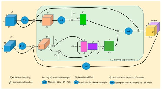 where in Equations (6) and (7) is the operation of positional encoding. and in Equation (8) are calculated from , and they are obtained by multiplying with the learnable parameters and in the matrix, respectively. Of course, we also need some necessary dimensional transformation. is the channel number of . in Equation (9) is also a set of learnable parameters, includes max-pooling, , batch normalization and Relu, so the output feature map size of the will be halved. Each variable is shown in Figure 2.