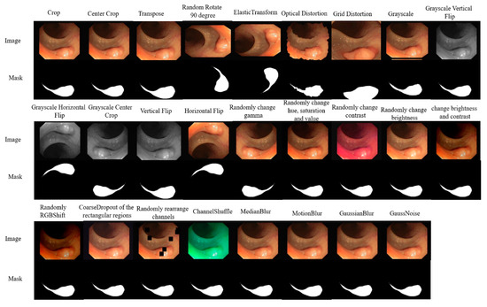 When the training samples are insufficient, the network may overfit, and since medical images are often scarce, it becomes crucial to increase the number and diversity of samples to improve the network’s robustness. To achieve this, we applied 25 types of data augmentation methods, including center crop, random rotation, transpose, elastic transform, etc., to each dataset. Figure 3 shows an original image in CVC-ClinicDB and its corresponding augmented images by 25 kinds of algorithms. For each dataset, the samples were split into three subsets: 80% for training, 10% for validation, and the remaining 10% for testing. We first divided the dataset into training, validation and testing sets and then used 25 kinds of methods to augment them.