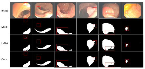 A careful visual analysis of the result is shown in Figure 4. In the first two columns of Figure 4, we can see that U-Net misclassified the parts that do not belong to the target. It can be seen from columns 3–6 in Figure 4 that because the boundary between polyps and their surrounding mucosa is unclear, and polyps have different sizes, colors, and textures, it is difficult for U-Net to segment the target accurately. However, our network can segment some smaller targets and targets with unclear edges more accurately. See the red boxes in Figure 4 for more details. Although our improved skip-connection can make up for some missing information, compared with the mask, our method still has some inaccuracies, such as the second, fourth and last columns. There are two main reasons for this issue. First, the quality of samples includes the quality of samples collected and the quality marked by professional doctors should be enhanced. Second, the performance of the model itself also needs to be further improved, which mainly includes the ability of the network to extract features and the further improvement of the compensation method for lost information in the process of feature extraction.