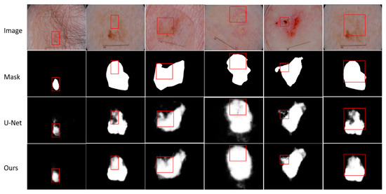 The results of visual analysis are shown in Figure 5. We need to segment the target with possible skin diseases from dermoscopy images, even when the skin diseases have different characteristics. Although the same disease appears in different people, the size, boundary and color of the affected area may be different, and there may be some other problems such as hair interference. We select some results with obvious contrast effects to show. Through the comparison of visualization results, it is not difficult to find that our method is better than U-Net in segmenting skin diseases with unclear boundaries and unclear targets. For the segmentation of small targets, such as the first column, our method is better than the baseline method. More details are shown in Figure 5. The red box shows the segmentation results of the same area in the same image using different methods.