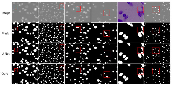 In Figure 6, we visualize the segmentation results of our method compared to baseline U-Net. Our method exhibits an advantage in effectively segmenting small objects. As shown in the first, fourth and sixth columns, we observe that the nuclei missed by U-Net can be identified by our method. In the second and third columns, we observe that our method is better than U-Net in identifying targets. Although our method may not be optimal, as shown by previous experiments, our method is better than the baseline method and some recent work.