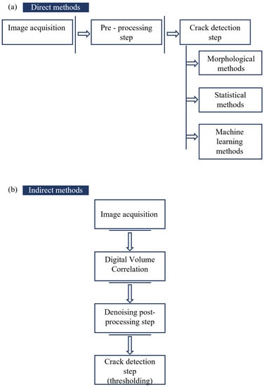 Scheme of direct (a) and indirect (b) crack-detection methods. The proposed TV-reg method falls under the indirect category.