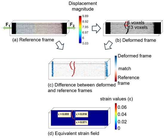 The proposed crack-detection method belongs to the category of indirect methods, which rely on information provided by the displacement and/or strain field. In contrast to direct methods, indirect methods identify cracks by detecting discontinuities in the displacement field, which correspond to peaks in the strain field [10,13]. The displacement and strain fields used in this study are computed from images using digital image and volume correlation techniques [14]. From a mechanical perspective, the use of DVC to compute the strain field can provide valuable insights into the deformation behavior of the material and its response to external loading conditions.