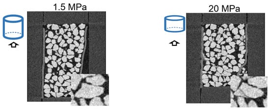 We utilized a 4D quartz sand dynamic dataset acquired during a uni-axial compaction experiment [44] (Figure 4). The dataset is available through the Yoda portal of Utrecht University [45] and was acquired using the Environmental Micro CT scanner (EM-CT) [46]. During the -CT scans, 800 projections were taken over 360° at 120 KV acceleration voltage and 8 W output power. The voxel size was set to m, and volume reconstruction was performed using the Octupus software [47]. The sample had a diameter of 2 mm, with initial length varying between 1.4–2.5 mm. A compression was performed at different loads between 1.5 MPa and 50 MPa, resulting in ten scans. The first measured quartz grain breakage occurred at 20 MPa.