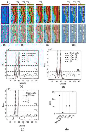 (a) Simulated strain field. (b) Noisy strain field in the proximity of the crack, computed without any filtering steps or regularization. The strain field is shown at three different levels of threshold (). (c) Strain field obtained by applying a median filter with different windows sizes applying . (d) Strain field in the proximity of the crack, computed using TV-reg ( = 0.1). The strain field is shown at three different levels of threshold. (a–d) the bottom row contains the strain field overlaid with the correspondent slice of the cracked volume. (e) Crack profile and noisy strain field profile, the three threshold levels are reported. (f) Effect of the variation of the window filter size on the strain profile. (g) Crack profile and TV-reg strain profile, the three threshold levels are reported. (h) Mean absolute strain error computed between the simulated strain field and the computed strain field by using TV-reg, smooth-reg and no regularization (no-reg.)