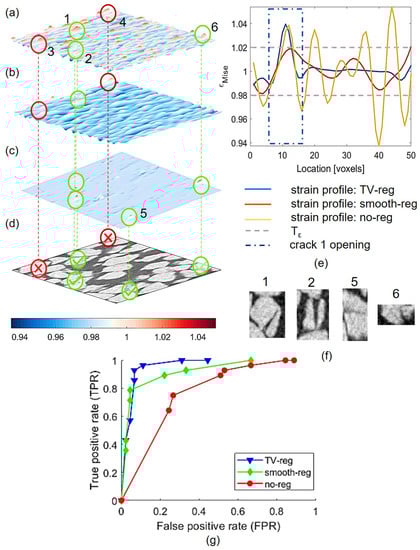 The figure shows one slice of the volume with cracks (d) and the same slice of the strain field (a–c) computed using three different methods: DVC without TV-reg regularization (a), with smooth-reg (b), with TV- regularization (c). (e) shows the strain profile in the proximity of the crack number 1. (f) Details of the cracks. (g) Receiver operating characteristic (ROC) to show the FPR and the TPR at different values of thresholds for the three methods: DVC with TV regularization; DVC with smooth filtering; DVC without regularization.