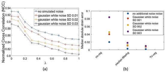 Figure 7. (a) Sensitivity of NCC to regularization parameter at different noise levels. (b) Mean absolute strain error was computed using TV regularization method with , with median filtering (using a window size of 7 voxels) applied to the displacement field, and without any filtering or regularization. The error was calculated after registering images with additional Gaussian white noise with different standard deviation (SD).