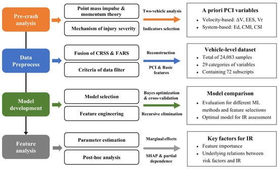 This study proposes a framework combining the PCIs and ML models to explore relevant factors of IR with full consideration of the impact mechanics and the a priori information. The formulations of several PCIs are proposed on the basis of the impulse–momentum theory, and six ML models were applied with a fusion dataset containing adequate crash cases. The model results are further investigated to identify the intrinsic crash patterns for different impact types with proper interpretation methods. This framework provides a major overview of the benefits and drawbacks of several PCIs, showcases their applicability in understanding the complex crash patterns, and explores favorable predictive methods for IR assessment in pre-crash scenarios.